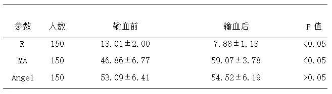 表1 臨床患者輸血前后R值和MA值Angle角值的比較