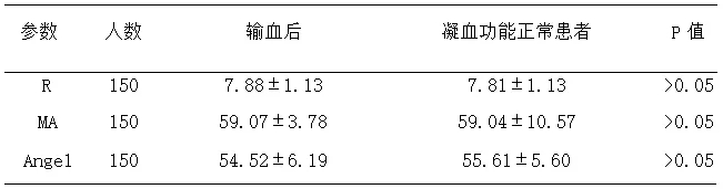 從2345名輸血患者中隨機抽取150名患者,對比其輸血前后的R值和(或)MA值進行統計比較(統計表1所示)。并對150名患者輸血后的R值和(或)MA值與從凝血功能正常的患者中隨機抽取150名正常患者的R值和MA值進行比較(統計表2所示)。